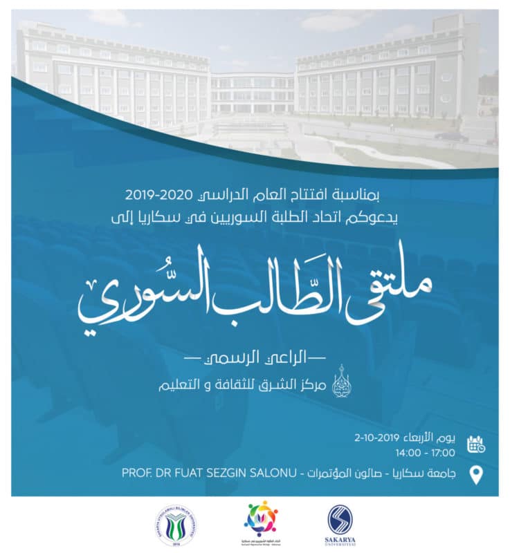 بمناسبة افتتاح العام الدراسي 2019-2020 يدعوكم اتحاد الطلبة السوريين في سكاريا إلى “ملتقى الطالب السوري” . و ذلك يوم الأربعاء 02.10.2019 الساعة 14:00 في kongre merkezi .