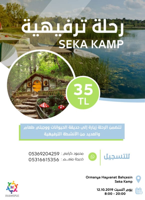 ينظم اتحاد الطلبة السوريين في سكاريا رحلة شواء ترفيهية يوم السبت 12.10.2019 سيتم التوقّف في حديقة الحيوان ORMANYA HAYVANAT BAHÇESİ ، تتضمن الرحلة العديد من الأنشطة والفعاليات الترفيهية . ينتهي التسجيل يوم الجمعة الساعة 15:00 . رسوم التسجيل 35TL . للتواصل والتسجيل : محمود كرامي : 05369204259 خديجة منعم : 05316615356