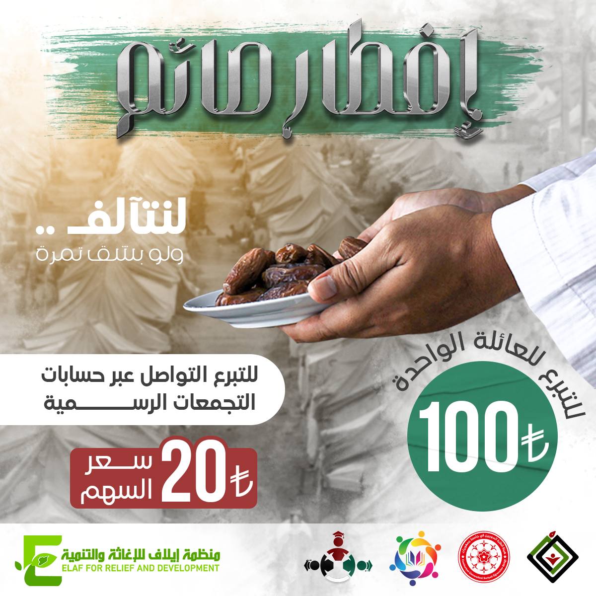 *لنتآلف.. ولو بشق تمرة* نحن سند لكم وإفطارنا يكتمل بمساندتكم لن نفطر صائماً بالطريقة المعتادة ..بل بحثنا عن العوائل في المواقع الحغرافية ذات الأوضاع السيئة التي لاتصلهم أقواتهم .. وتبنينا تفطيرهم بدعمكم وجهودكم .. تعلن منظمة ايلاف للإغاثة والتنمية العاملة في الشمال السوري المحرر وبالتعاون مع التجمعات الطلابية في كل من ( سكاريا – زونغولداك […]