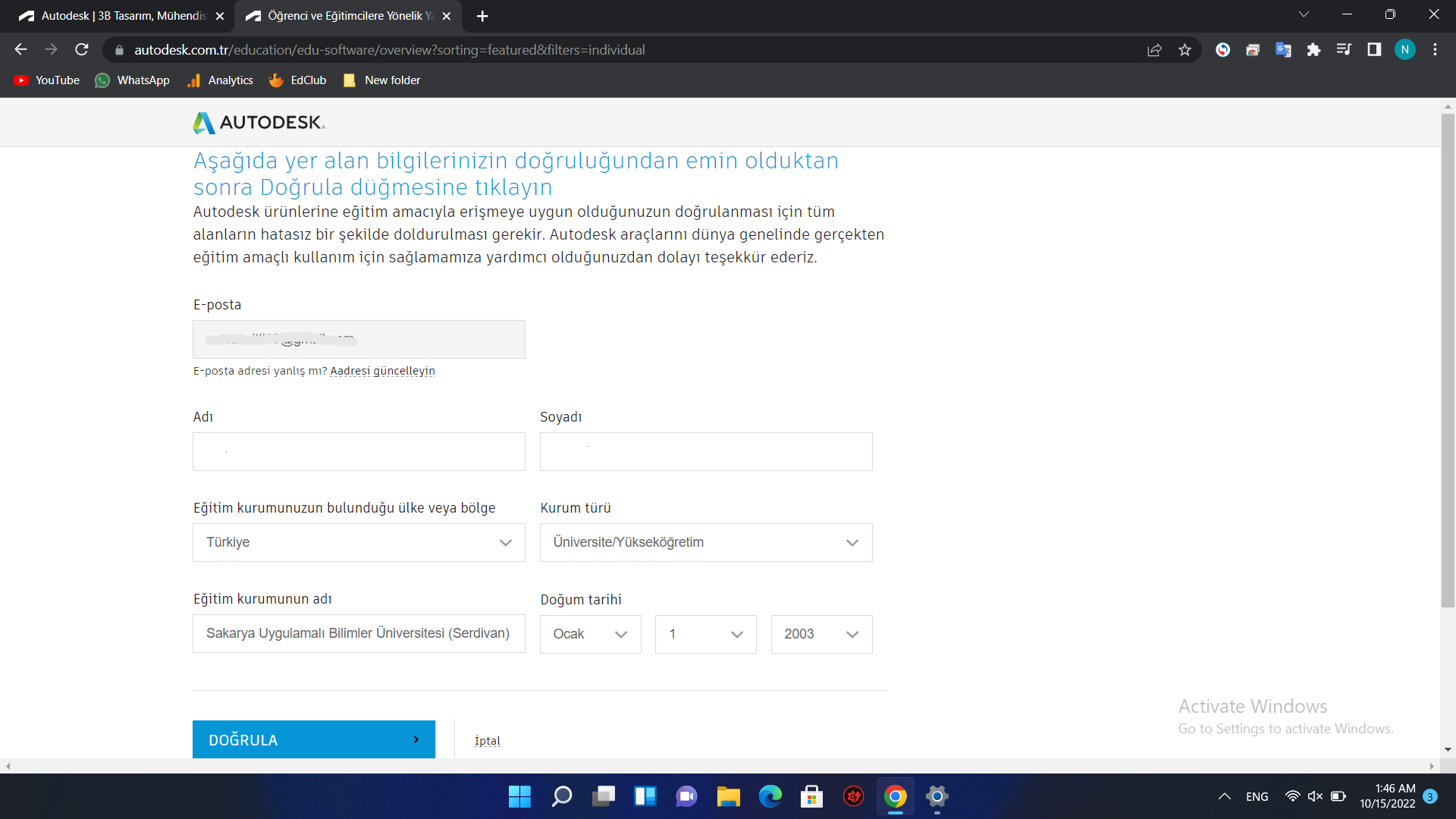 سادساً: قم بتعبئة البيانات ثم الضعط على Doğrula.