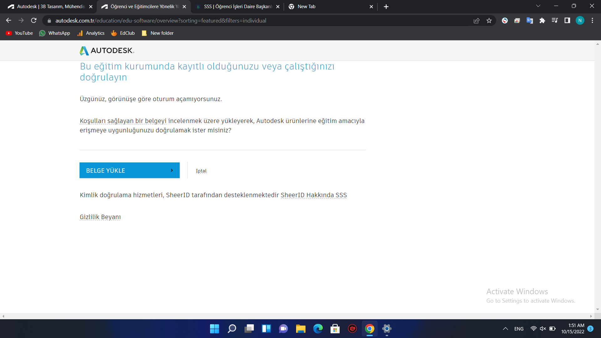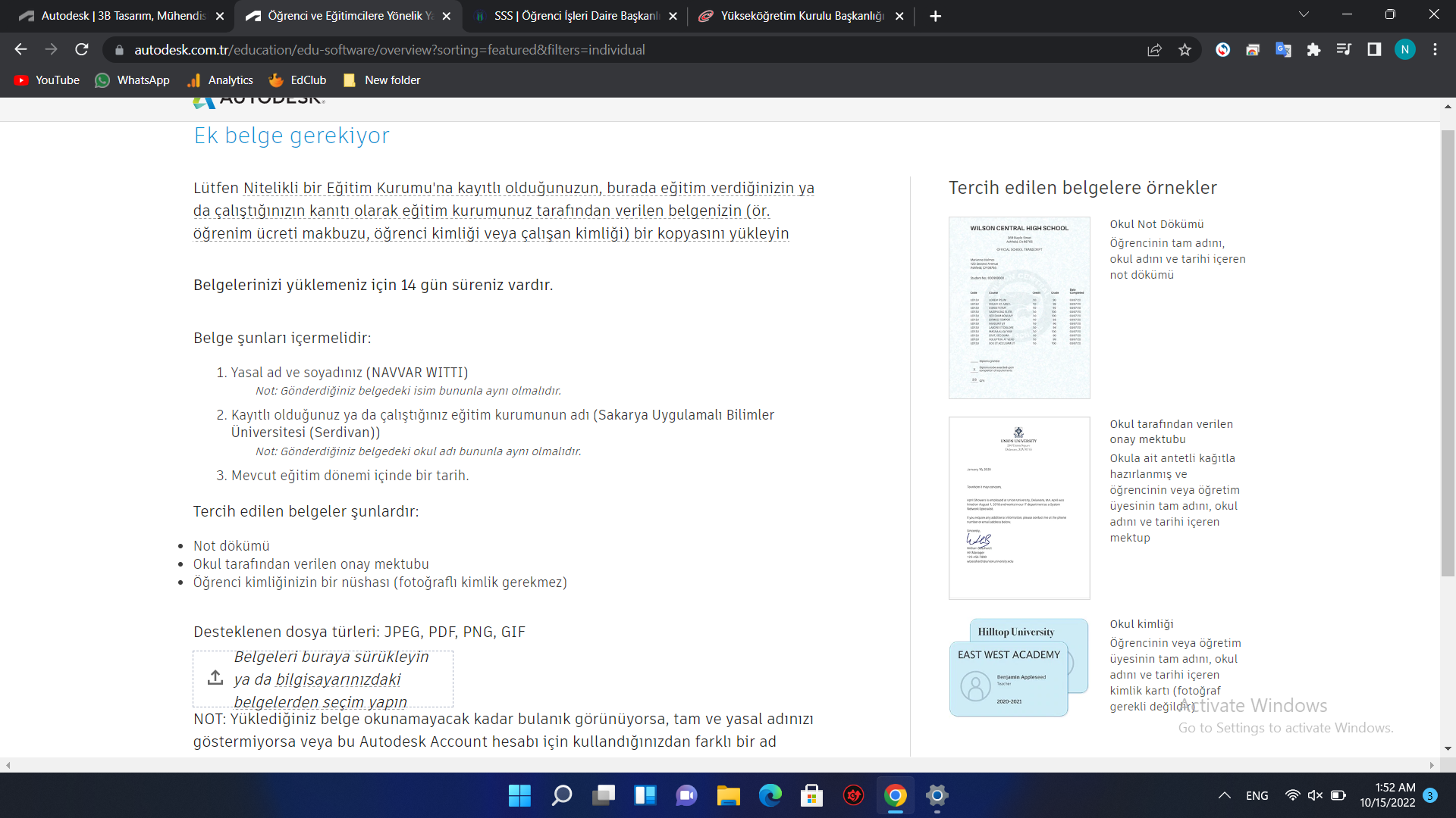 بعد الضغط على المتسطيل الأزرق سيطلب الموقع تحميل أي وثيقة تثبت أنك طالب جامعي ( قم بتحميل بطاقة الطالب أو ورقة الطالب) ثم الضغط على زر Gönder.