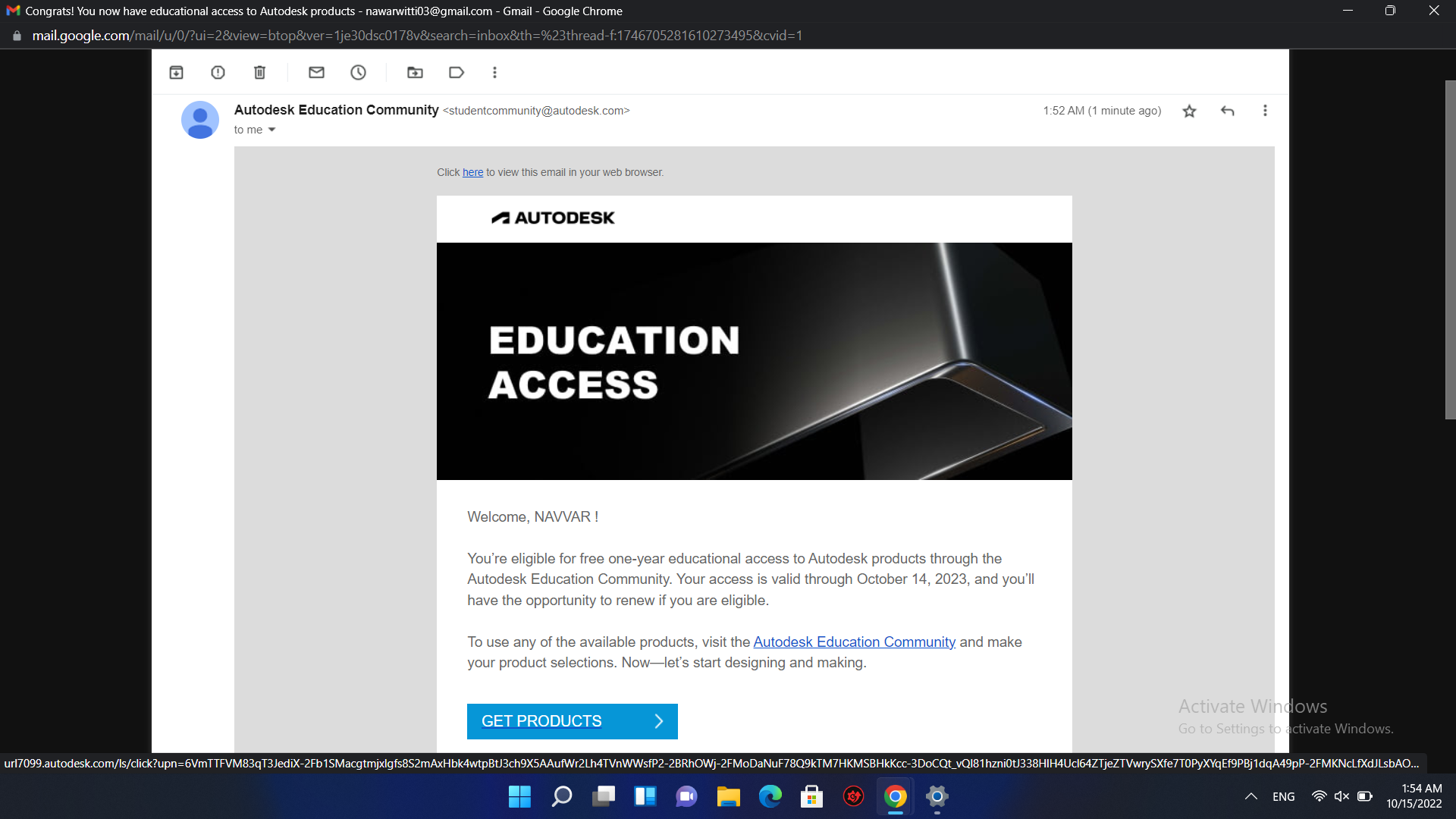 بعد تحميل الوثيقة سوف يتم إرسال لك أيميل من قبل أوتوديسك في غضون ثوان معدودة لتأكيد طلبك.قم بالضغط على خيار Get Products.