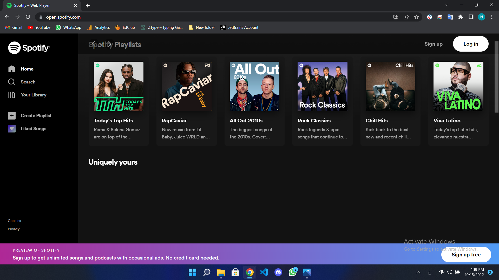 أولاً: قم بتحميل تطبيق سبوتيفاي (متوفر في جميع المنصات) أو قم بزيارة الموقع الرسمي (إضغط هنا) ثم قم بتسجيل الدخول عن طريق زر Log in الموجود على يمين الشاشة.